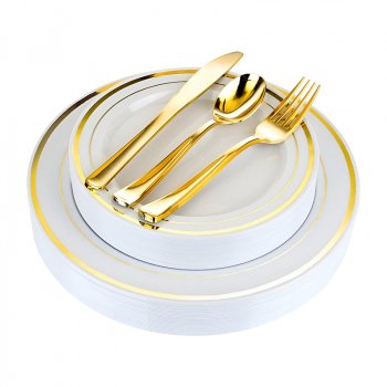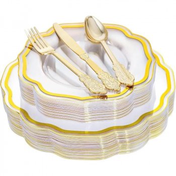 350PCS White and Gold Disposable Dinnerware Set for Parties and Events